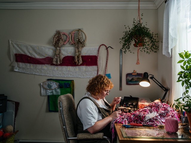 Bethany MacKenzie (she/they), a Queer emerging interdisciplinary artist, is seen working on her project titled – The Land Has Always Seen Me, in her home studio in Bonavista, NL. (Johnny C.Y. Lam 07-08-2024)