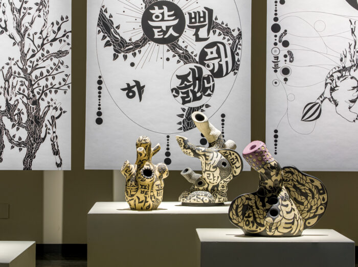 Through still, flat, and dimensional images and forms, I use visual symbolism and intuitively generated drawing compositions. The use of multiple mediums and structures suggests a translation and slippage between expression and meaning. I attempt to visualize my emotional and psychological negotiation of expressing myself between my mother tongue and newly adopted languages.