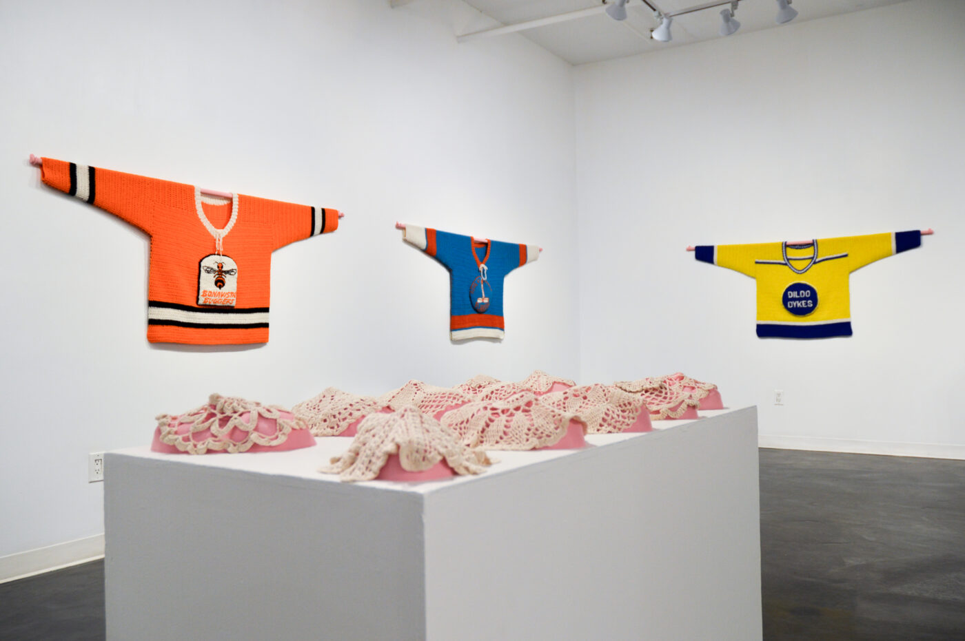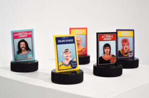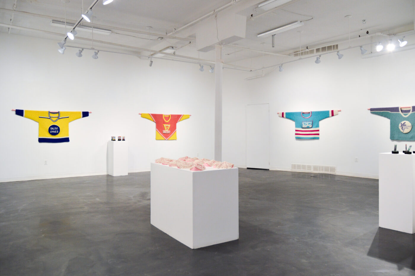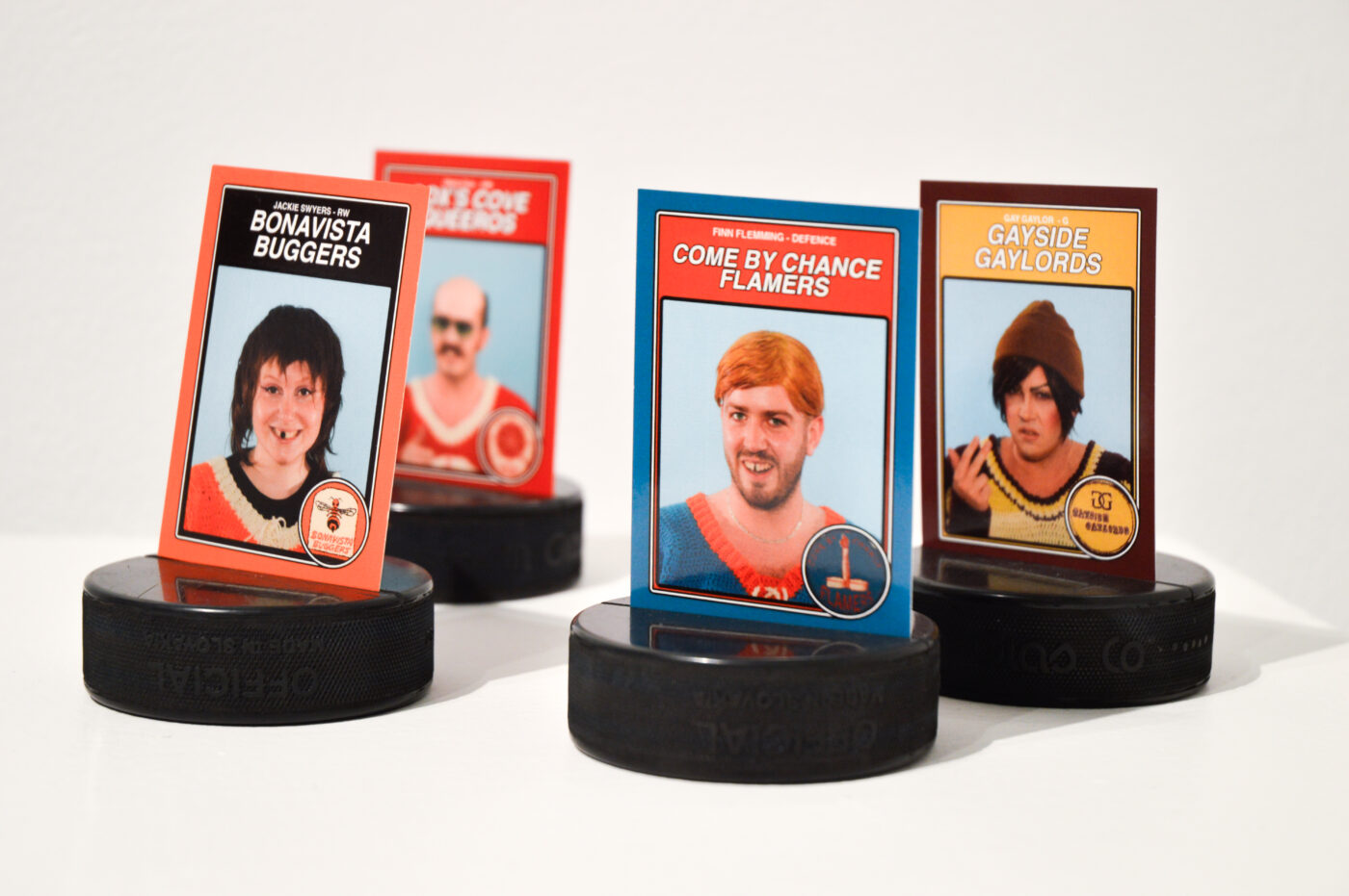 Queer Newfoundland Hockey League (QNHL) is a fictional hockey league made up of 14 teams, all with team names that include pejoratives used against the 2SLGBTQIA+ community. The artist’s reclamation of these terms not only critiques existing hegemonic masculinity in sports culture, it also aims to create a new, positive, and accepting masculinity for sports enthusiasts.