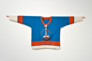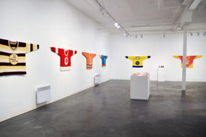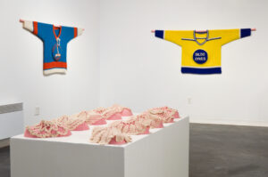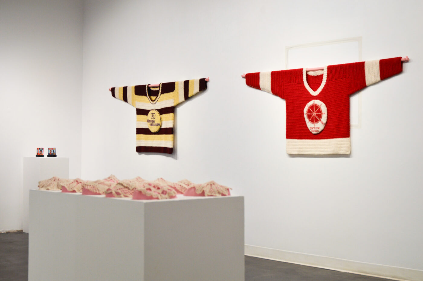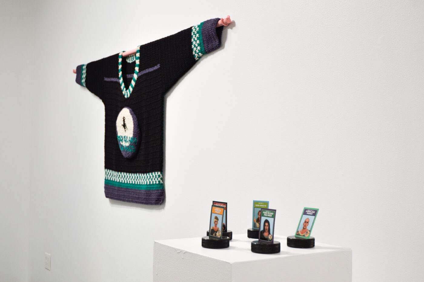 Queer Newfoundland Hockey League (QNHL) is a fictional hockey league made up of 14 teams, all with team names that include pejoratives used against the 2SLGBTQIA+ community. The artist’s reclamation of these terms not only critiques existing hegemonic masculinity in sports culture, it also aims to create a new, positive, and accepting masculinity for sports enthusiasts.