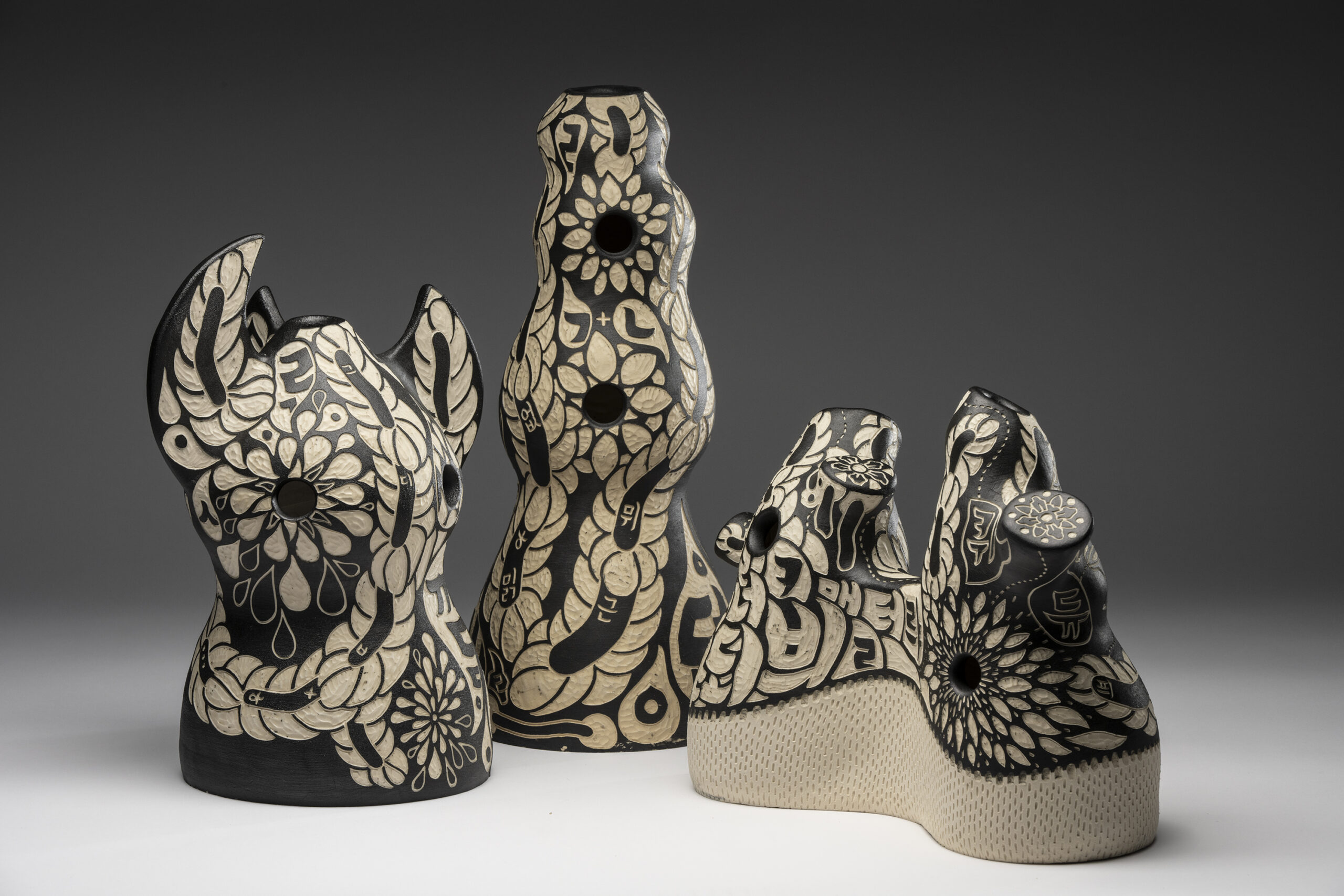 The monochromatic imagery becomes a migrant pattern that reflects different methods of communication. These patterns move across mediums—directly on paper, scaled up through digital prints, and becoming undulated imagery by carving into wet clay. Each material presents a different threshold, mirroring the physical and mental effort of adjusting to a new environment. Through the presentation of these various mediums across the space, I aim to visualize the complexities of linguistic adaptation, reflecting human flexibility while showing the slippage through visual fragmentation.