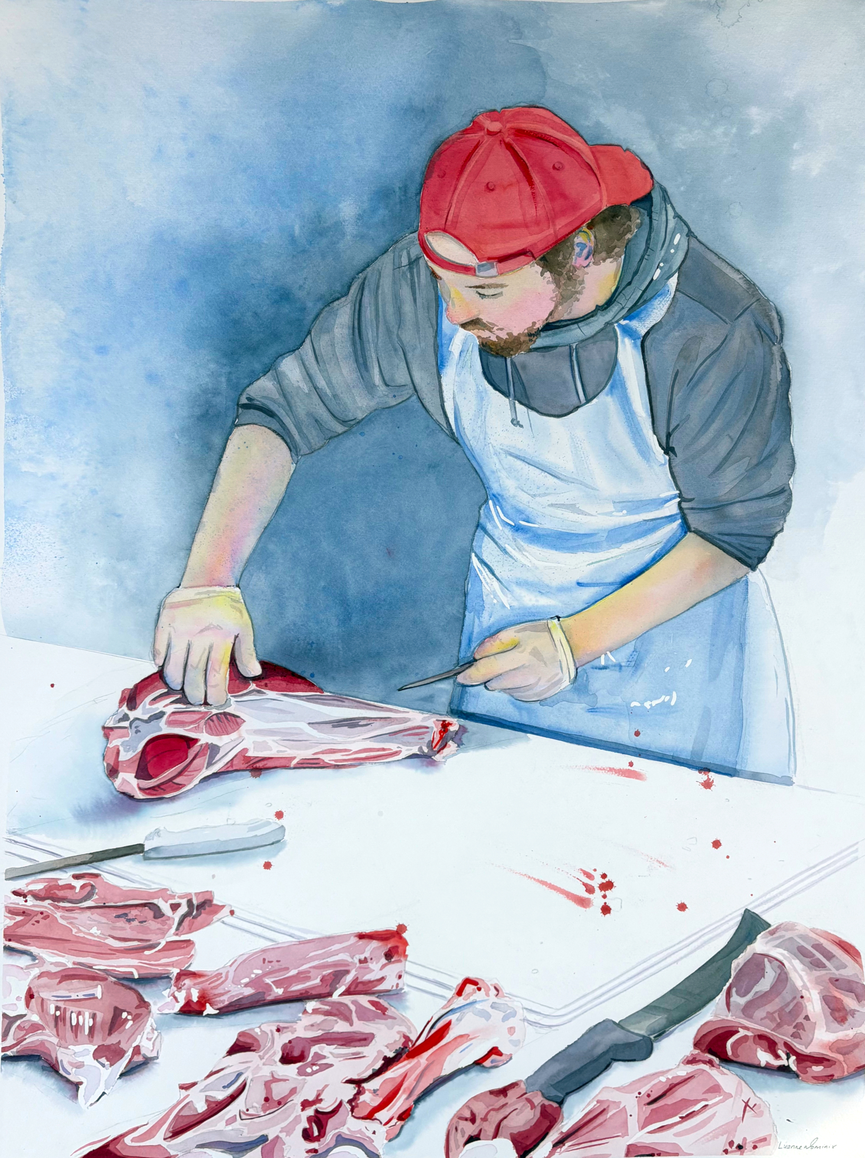 With Quiet Hands is a series of watercolour paintings that explore the delicate balance between tradition and modernity. Through a reverent celebration of butchery as both craft and ritual, the work reflects on our relationships with food, identity, and sustainability.